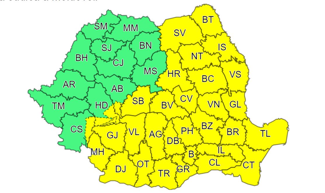 “Indicele temperatură-umezeală (ITU) va atinge pragul critic de 80 de unităţi al disconfortului termic în sudul Olteniei, sudul şi estul Munteniei, vestul Dobrogei şi extremitatea sudică a Moldovei” precizează ANM.