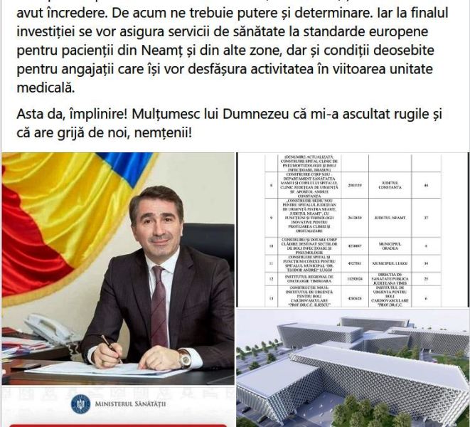 Județul Neamț este unul dintre beneficiarii unei astfel de investiții, prin care vom construi un spital județean. De-acum au trecut etapele care depindeau și de alții! E scris negru pe alb că județul Neamț, prin proiectul Consiliului Județean, va avea un spital nou și mingea e în curtea noastră, a administrației județene!