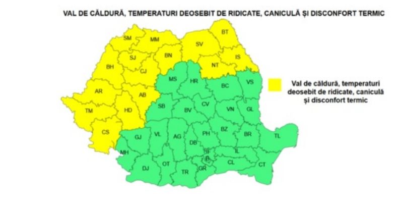 Meteorologii au actualizat prognoza și au emis o nouă avertizare prin care anunță temperaturi deosebit de ridicate pentru începutul lunii septembrie, precum și disconfort termic. Atenționarea cod galben este valabilă pe 5 septembrie în intervalul orar 12:00 – 21:00 și vizează mare parte din țară inclusiv parte din județele Moldovei, Neamț, Suceava, Botoșani și Iași.