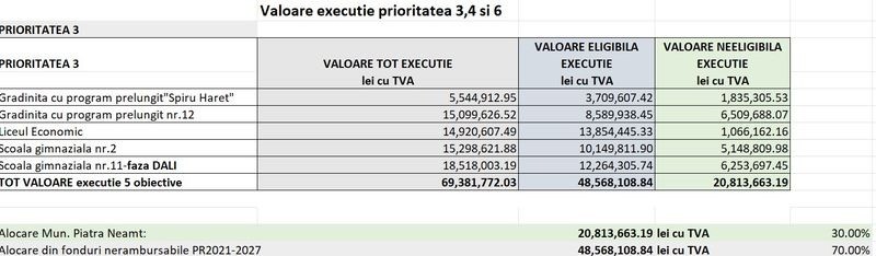 Potrivit celor două proiecte din ședința de luni, în devizul general, 13,6 milioane de lei (inclusiv TVA) este suma eligibilă din care 8,4 milioane de lei – pentru partea de construcții montaj, în timp ce primăria se angajează să plătească de la bugetul local 11,5 milioane de lei, reprezentând atât cheltuielile neeligibile cât și procentul de 2%.
