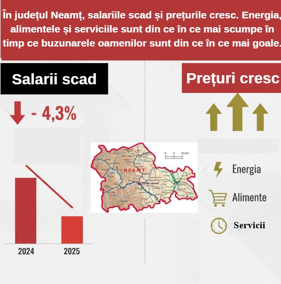 În acest context, scăderea salariului mediu pune și mai multă presiune pe familiile din județ, care deja plătesc tarife ridicate la utilități și se confruntă cu creșterea costului vieții. Fără măsuri de sprijin pentru investiții, fără politici salariale care să țină pasul cu inflația și fără proiecte reale de dezvoltare regională, Neamțul rămâne într‑o zonă gri a economiei naționale, cu salarii tot mai puțin competitive chiar și la nivelul României.