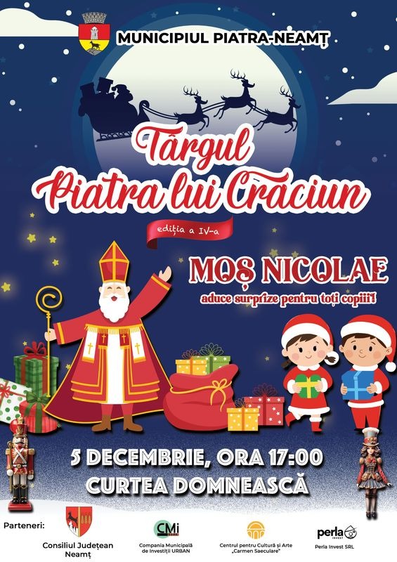 Copiii din Piatra-Neamț sunt așteptați vineri, 5 decembrie, la întâlnirea cu Moș Nicolae, în centrul orașului. Curtea Domnească va deveni, începând cu ora 16:30, un tărâm de poveste, plin de lumină, muzică și surprize pregătite pentru cei mici.