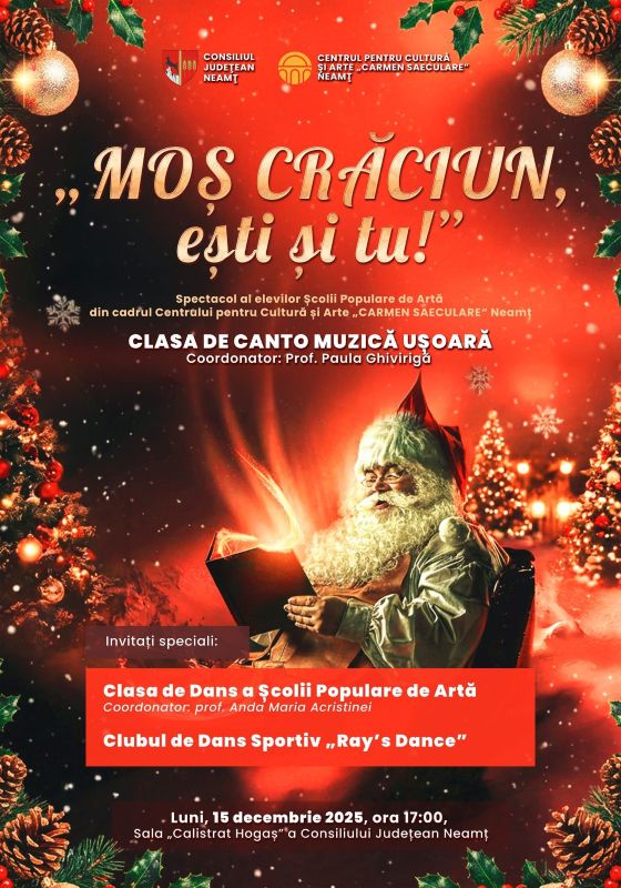 Elevii Clasei de canto – muzică ușoară din cadrul Școlii Populare de Artă vor aduce spiritul Crăciunului pe scenă, prin concertul intitulat „Moș Crăciun ești tu!”, un eveniment artistic dedicat sărbătorilor de iarnă, organizat de Centrul pentru Cultură și Arte „Carmen Saeculare” Neamț.