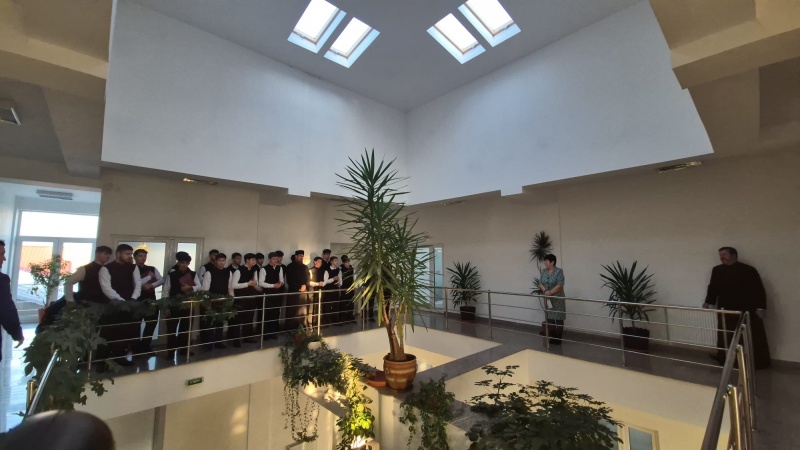 Seminariștii au adus în sala de ședințe a primăriei colinde tradiționale și cântări religioase, fiind întâmpinați de primarul Adriana Petrariu, consilieri locali și angajați ai instituției.