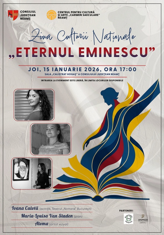 De Ziua Culturii Naționale poezia, muzica și artele vizuale se împletesc din nou pentru a deschide seria de evenimente organizate în anul 2026 de Centrul pentru Cultură și Arte „Carmen Saeculare” Neamț. În parteneriat cu Asociația Culturală „Pro Valores” și Academia Națională de Muzică „Gheorghe Dima” Cluj-Napoca, Extensia Piatra-Neamț, va avea loc recitalul de poezie și muzică desfășurat în cadrul proiectului „Eternul Eminescu”. Pe scenă vor urca două artiste de primă mărime: actrița Ioana Calotă, de la Teatrul „Nottara” din Capitală, și pianista Maria-Louisa van Staden, născută la București. Acestora li se alătură, pentru a completa simbioza artelor, Andreea Toma, artist vizual, originară din Piatra-Neamț, care vine în fața publicului nemțean cu o expoziție a celor mai valoroase lucrări ale sale.