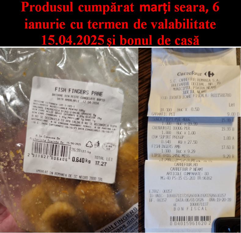 Potrivit unui comunicat transmis de Autoritatea Națională pentru Protecția Consumatorilor (ANPC), inspectorii CJPC Neamț au confirmat că operatorul economic a expus spre vânzare și a comercializat un produs alimentar cu termenul de valabilitate depășit. Este vorba despre produsul Fish Fingers AMB, a cărui dată a durabilității minimale expirase la 15 aprilie 2025.