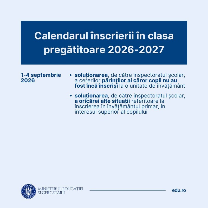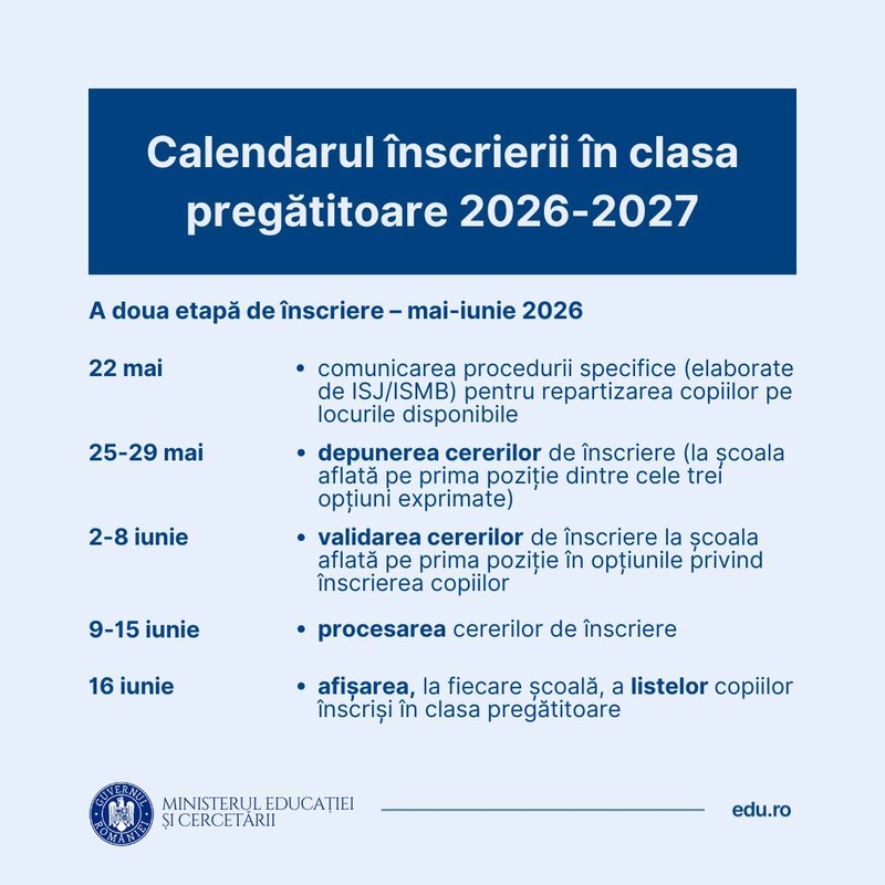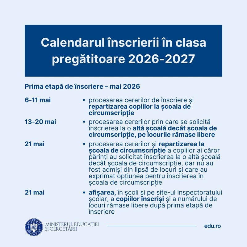 În perioada 31 martie – 6 mai 2026, părinții/ reprezentanții legali vor completa cererile-tip de înscriere online sau la unitatea de învățământ la care solicită înscrierea copiilor. În aceeași perioadă, vor fi transmise cererile-tip de înscriere la unitatea de învățământ, însoțită de recomandarea de înscriere în clasa pregătitoare, după caz, respectiv a declarației pe propria răspundere și a documentelor necesare în copie simplă.