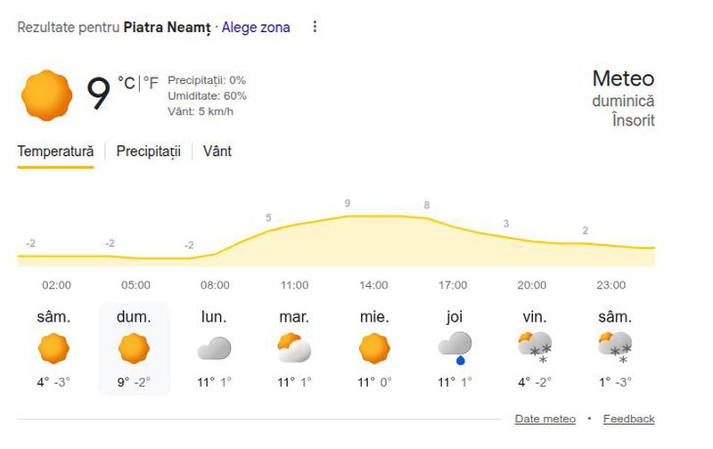 Duminică, 1 martie, în Piatra-Neamț vor fi temperaturi primăvăratice, de până la 9 grade Celsius.